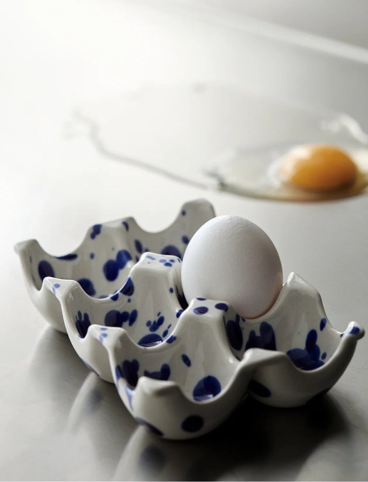 H&M Home'dan altı yumurta için yeri olan stoneware yumurta tepsisi. Her bir parçaya benzersiz bir görünüm veren alacalı sırlı. Yumurtaları saklamak veya kahvaltı masasında servis etmek için mükemmeldir. Yükseklik 3,7 cm. Derinlik 10,2 cm. Genişlik 15,4 cm. Bir defa kullandım. Son fiyat.