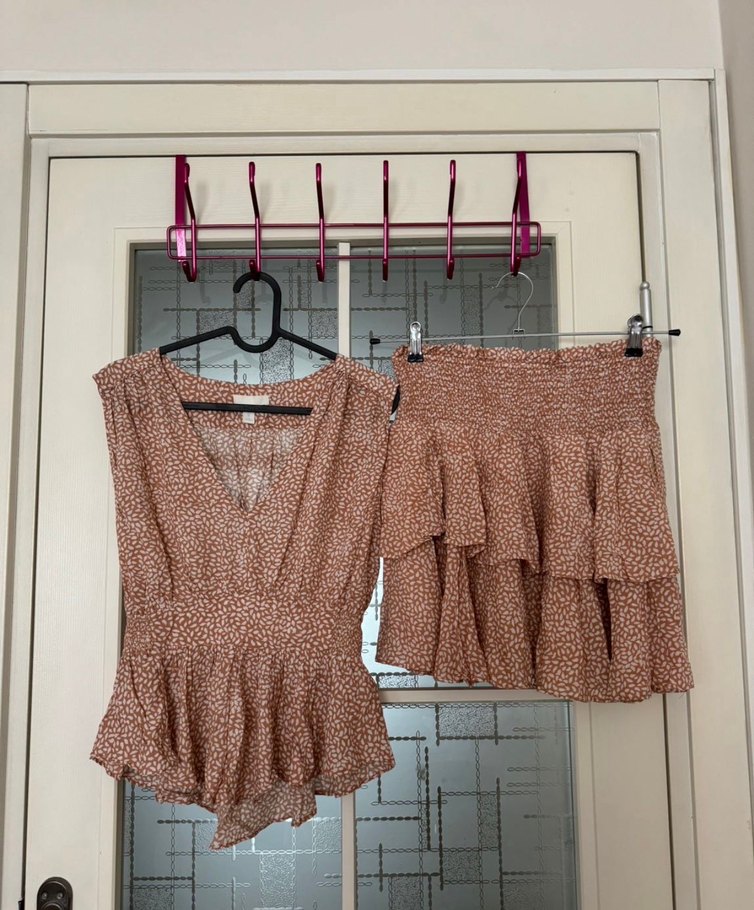 H&M ikili takım, V yakalı, kolsuz, bol kesim ve volan detaylı, hafif batik desenli sentetik kumaştan takım, 38 beden #H&M#takım#ikilitakım#bluz#etek