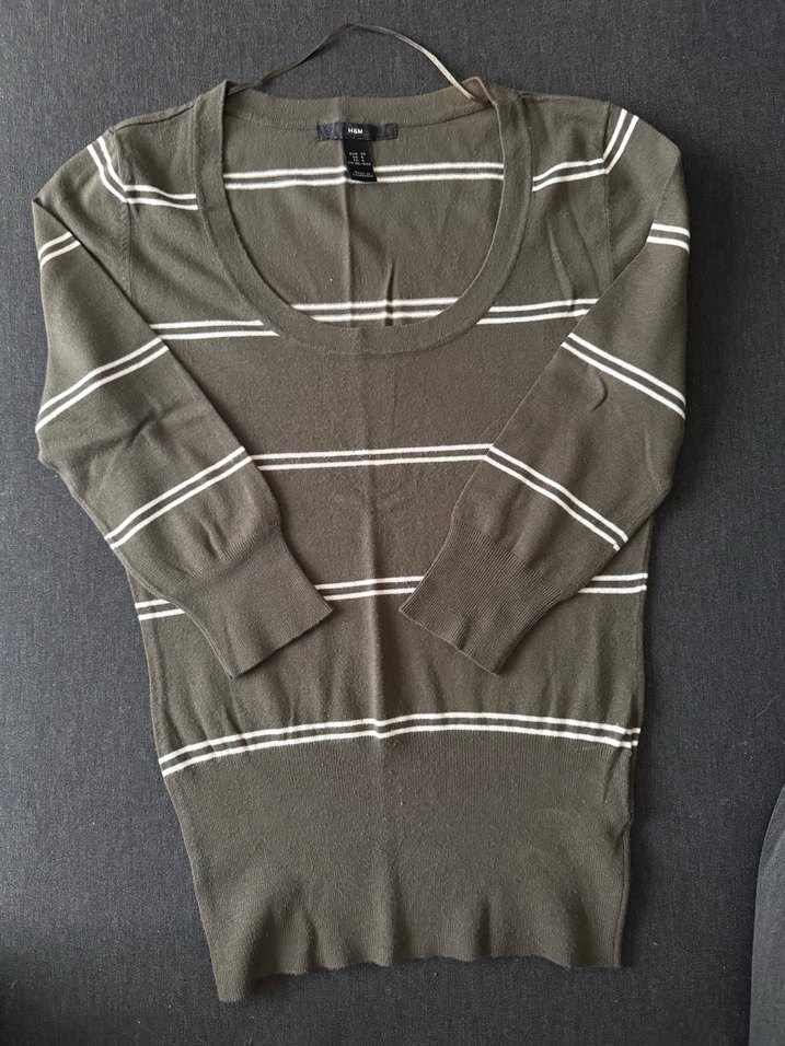 Pamuk örme kumaştan, turvakal kol ve ince çizgili, dar kesim bele oturan vücut şeklini alan kadın triko kazak. Rahat sokak stili için uygundur. H&M marka, 36 beden. Son fiyattır.