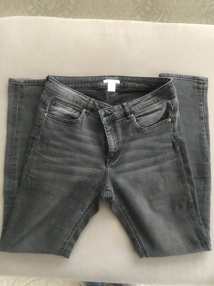 Düşük bel, midi boy ve düz tasarıma sahip gri kadın denim pantolon, günlük rahat kullanıma uygun.