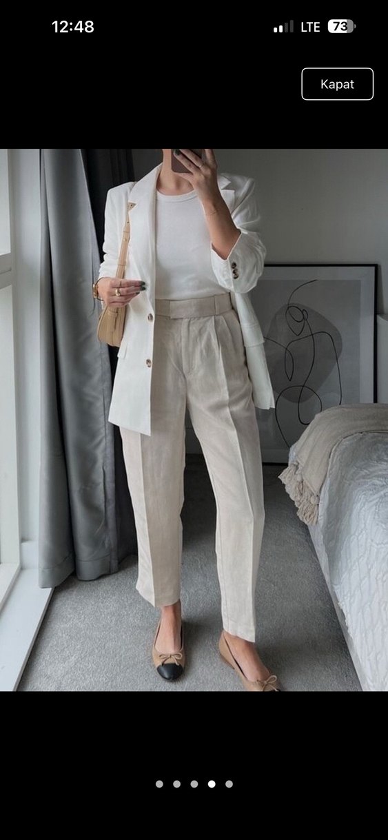 Bej keten düz kesim pantolon, regular fit ve midi boyda, minimalist ve şık bir ofis tarzı sunar.