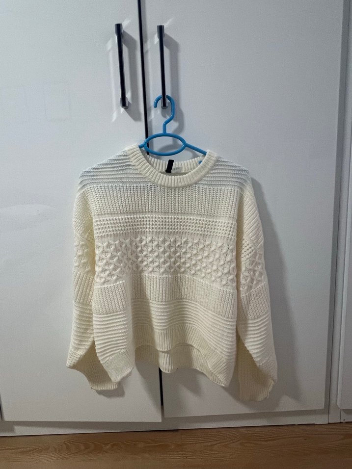 Beyaz örgü kumaştan, uzun kollu ve yuvarlak yakalı, salaş kesim kadın kazak. Rahat ve gündelik tarz için uygundur. Bir iki kez giydim. Tertemiz giymeye vaktim yok