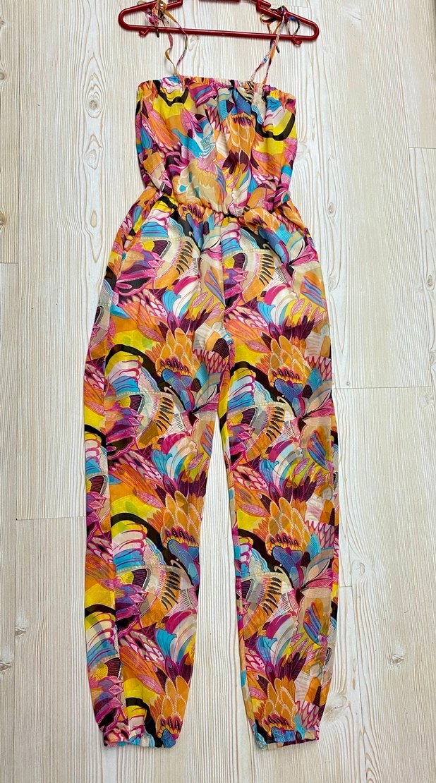 H&M Markası HİÇ GİYİLMEDİM. İki koltuk arası: lastikli 35cm (açık halinde 49cm) Bel: lastiki (açık halinde 44cm) Askılar ayarlanabilir✅ Paçalar lastikli, şort astarı (pantolon astarlı değil), 2 cepli. Hindistan’da üretilmiş. Yurtdışından aldım. 38 bedene de olur✅ Sağlam. hiç bir defosu ve kusuru yok. Çok renkli çiçek desenli, Tam yazlık. Sentetik kumaştan, askısız yaka ve piliseli tasarımlı, bol kesim çok renkli kadın uzun tulum, açık hava etkinlikleri için uygundur.