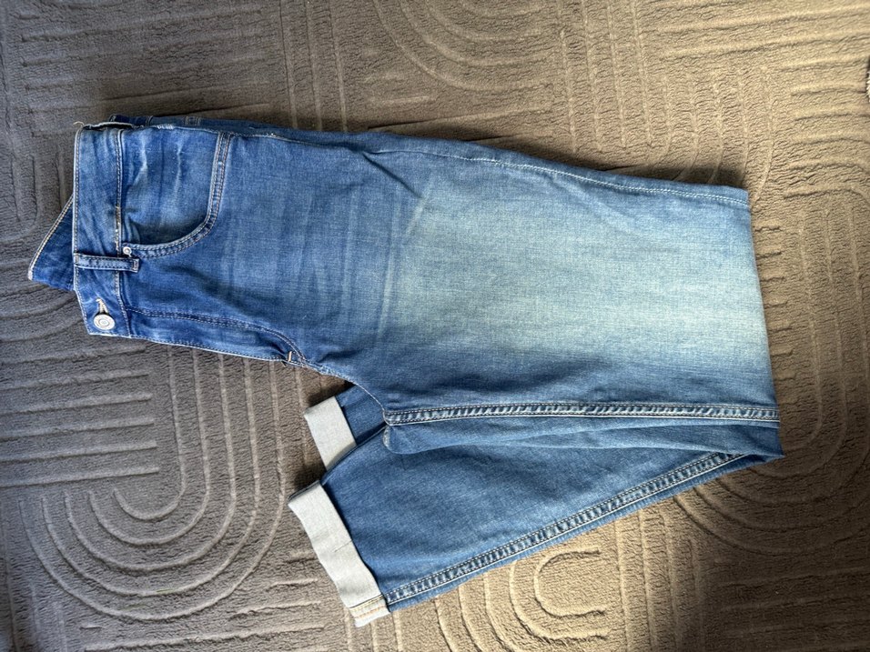 Düğmeli, midi boy, mavi denim kumaştan yapılmış, günlük kullanıma uygun, trend sokak stili için ideal, dar kesim kadın pantolon. H&M etiketine bakabilirsiniz yumuşak kumaşlı kot pantolon yepyeni duruyor paça detaylı , mesaj atın :)