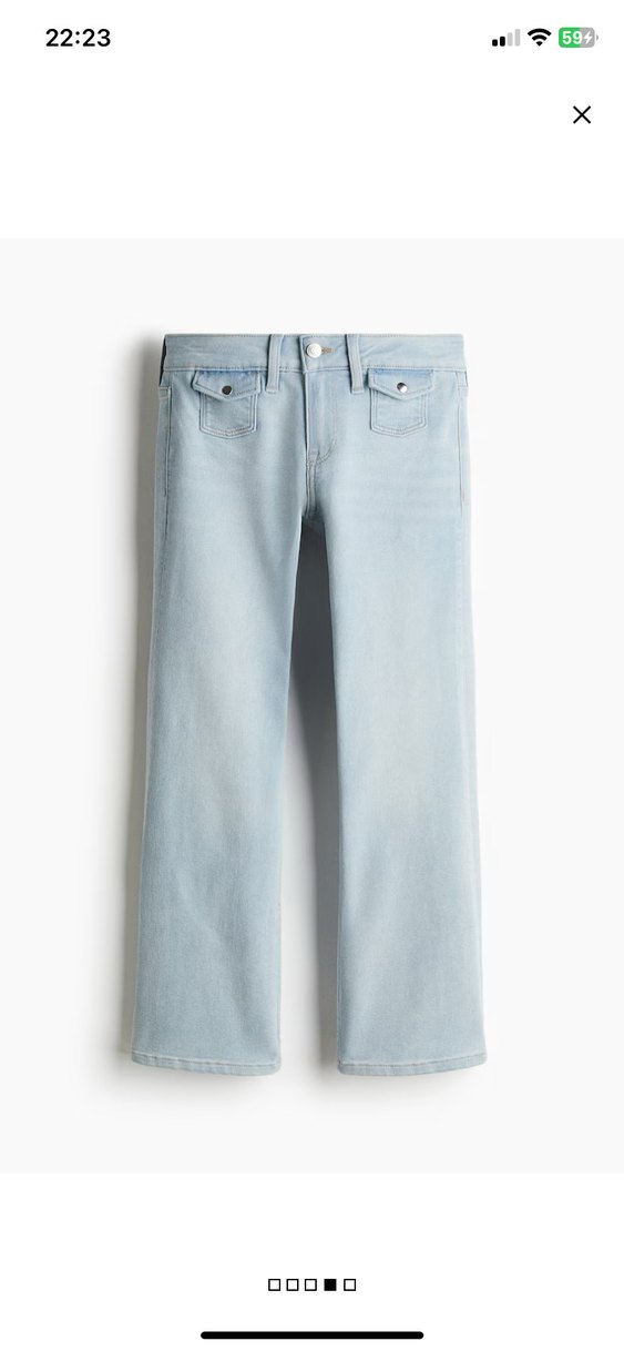 Renk: Soluk Kot Mavisi Beden: 42 (dar kalıp) Etiketli ürün hiç kullanılmadı. Konforlu kullanım için hafif streç özellikte kottan pantolon. İspanyol paçalı, belden üst bacaklara kadar dar kesimli, dizden paça ağızlarına doğru bollaşan kesimli. Düşük belli, fermuar patlı ve düğmeli. Ön cepleri kapaklı ve çıtçıtlı , açık arka cepli. Aşık kemiğine değecek şekilde bilek boyu uzunlukta tasarlanmıştır. Sezondan sezona geri dönen bir kesim. Ürün numarasi: 1263677002 (H&M sitesinden aratabilirsiniz)