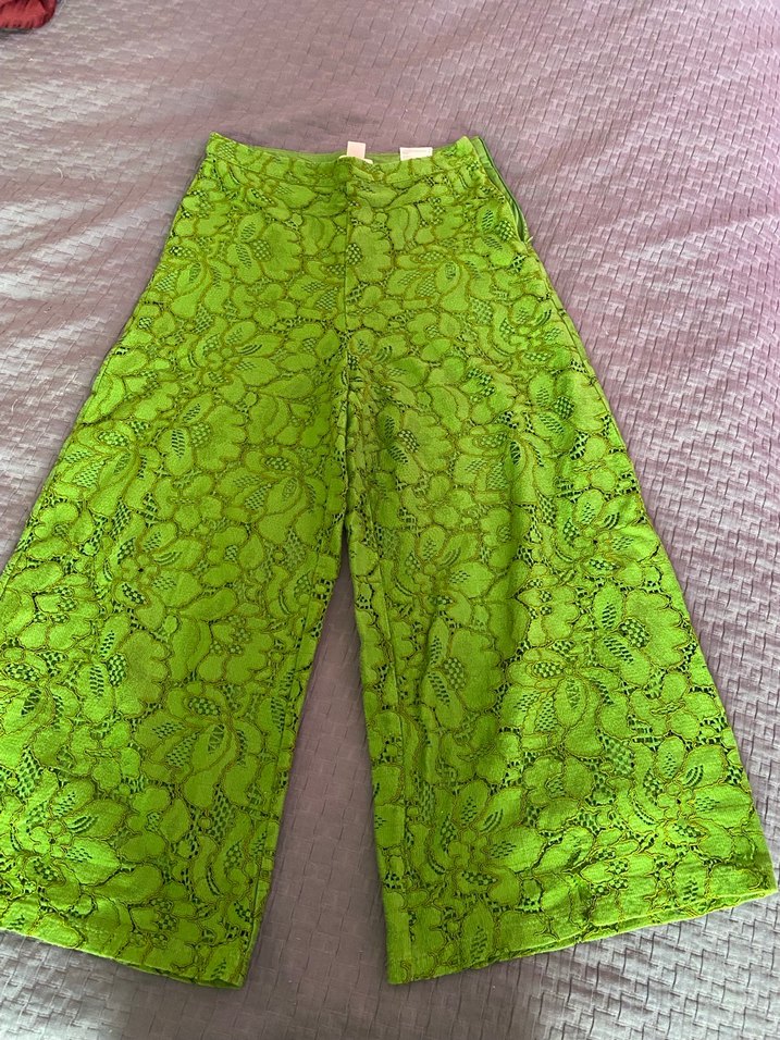Renkli yeşil dantel kumaştan, bol kesim ve uzun boy kadın pantolonu, bohem tarzıyla romantik buluşmalar için uygundur. orjinal üründür.