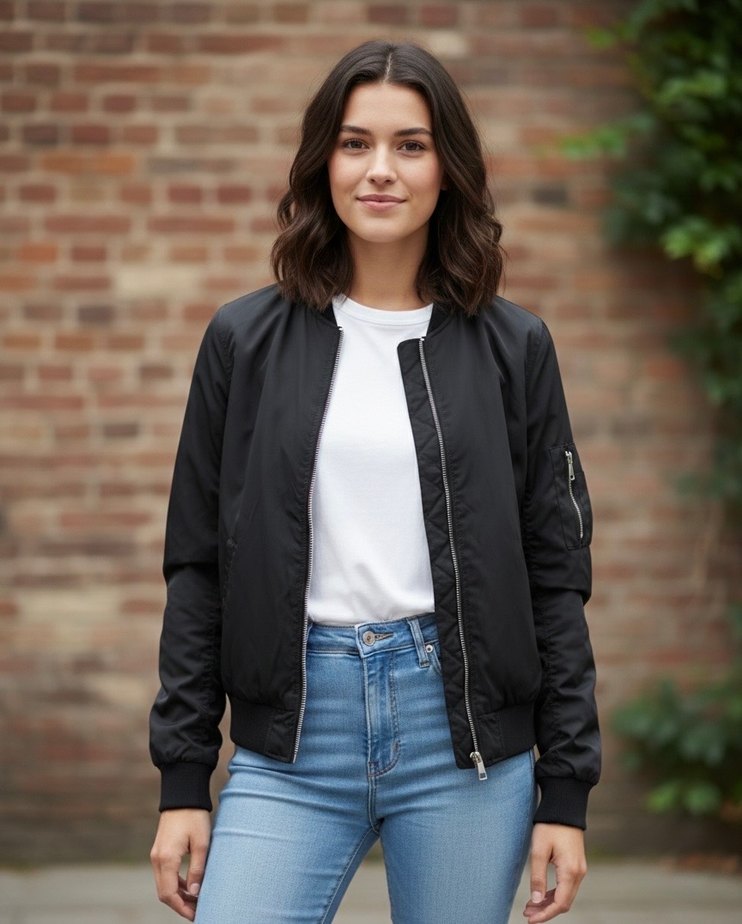 Siyah bomber ceket, bisiklet yaka ve uzun kollu, düz ve rahat kesimli, günlük kullanıma uygun.