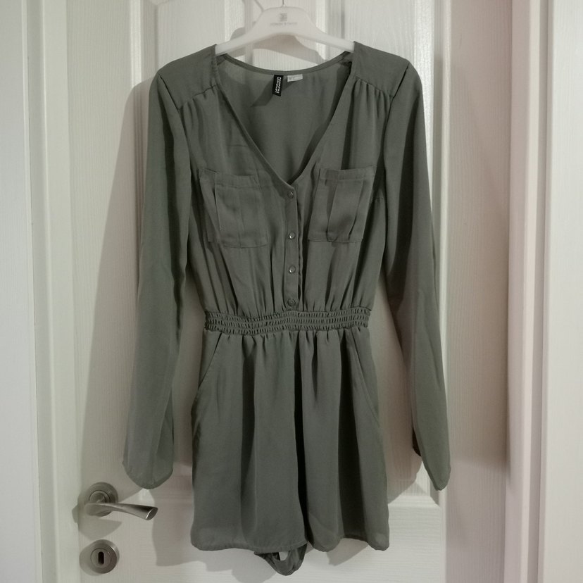 Bir veya iki kere kullanıldı.. H&M marka, 34 beden, haki renk, şifon kumaştan, uzun kollu ( istenirse katlanır düğmelenir ), ve V yakalı, düğmeli, bel kısmı lastikli rahat kesim şort tulum.. Günlük kullanıma uygundur.. Boy: 77 cm. İki kol altı arası: 42 cm. Kol uzunluğu: 60 cm. bel: ( lastikleri hiç esnetmeden ) 28 cm. Fotoğraflarda gördüğünüz gibidir..