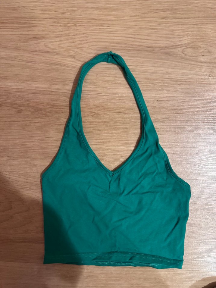Koyu yeşil renkte, V yaka, kolsuz ve vücuda oturan kadın crop top. Yumuşak sentetik kumaştan, spor ve athleisure tarzına uygun.