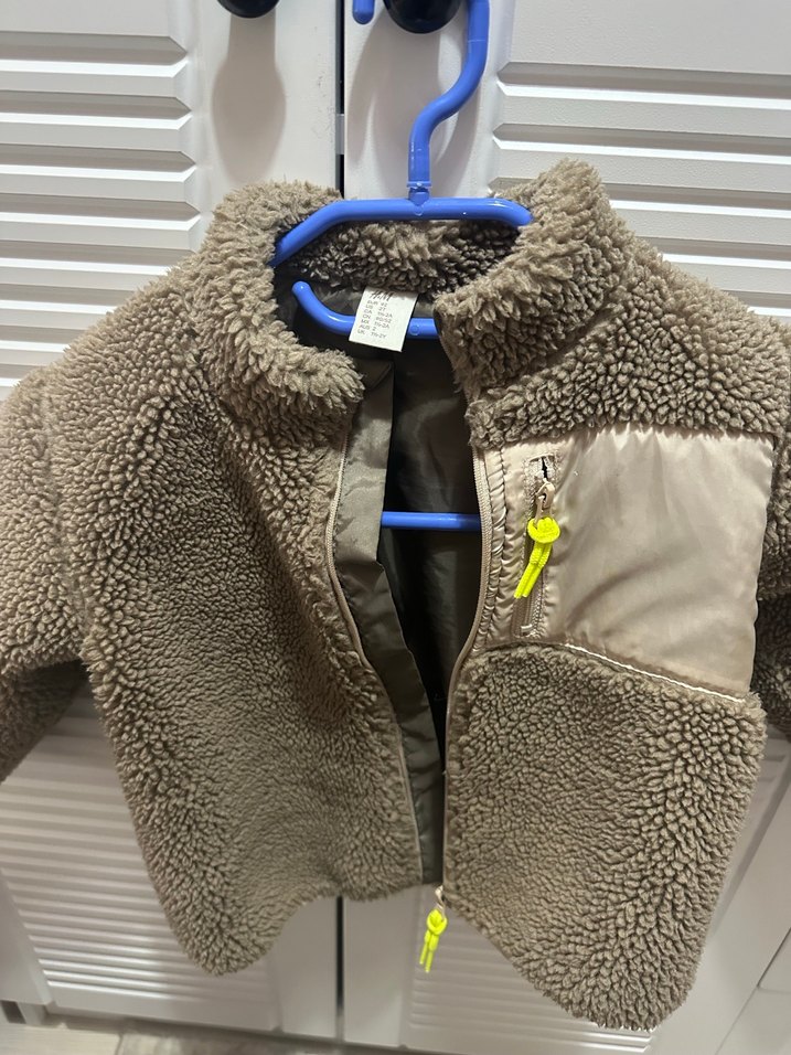 Kahverengi ve gri tonlarında, kürk detaylı, yakası bisiklet yaka olan, cep fermuarlı, içi astarlı erkek çocuk montu. Yeni gibi