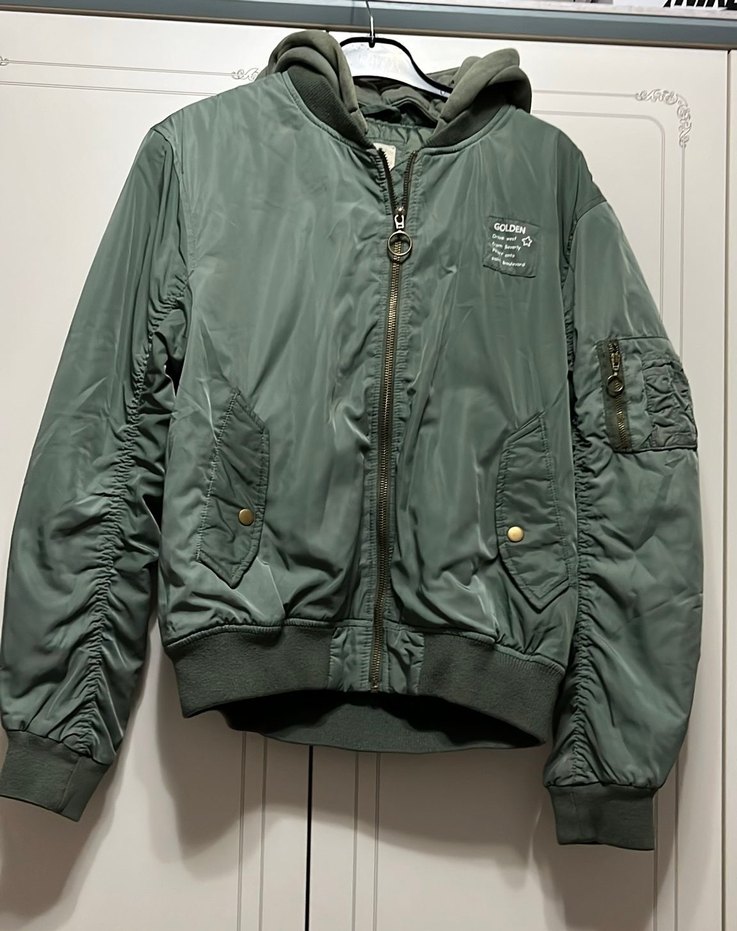 baya eski sezon bir urun etiketi 14 yas ama s beden uyumlu oversize bir ceket kalin seylerle de giyilir. kapusonu cikarilabiliyor. boy 60 en 47