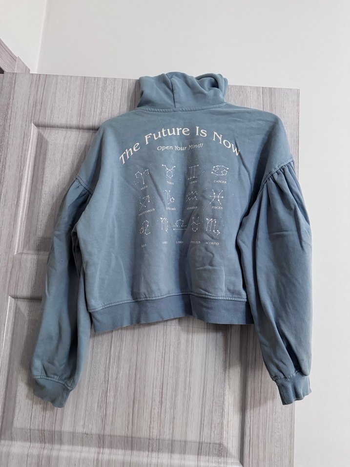Yumuşak fleece kumaştan yapılmış bol kesim mavi kadın sweatshirt. Sırtında baskı deseni mevcuttur. Rahat kullanım için uygundur. Bazı deformeleri olduğu için fiyat uygun tutulmuştur.