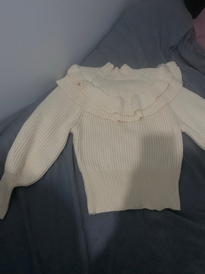 Beyaz renkte, örgü kumaştan, yuvarlak yaka ve uzun kollu, vücuda oturan, normal boyda kadın kazak. Yaka çevresindeki fırfırlı detay ile rahat ve şık bir görünüm sunar.