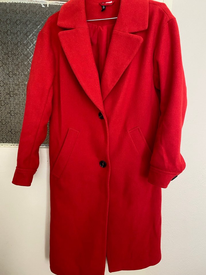 Kırmızı uzun kaban, yaka ve iki cep detaylı. Sadece 2-3 kez giyildi, sorunsuz.