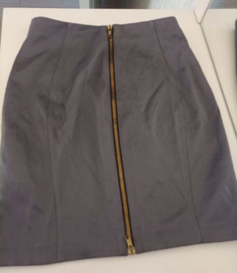 Yumuşak süet kumaştan yapılmış, arkadan fermuarlı gri midi kalem etek. Ofis kullanımı için uygundur.