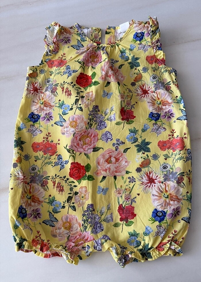 H&M kız çocuğu pamuk tulumu, arkadan düğmeli. Bacak kısmı lastikli. Beden 12-18 ay.