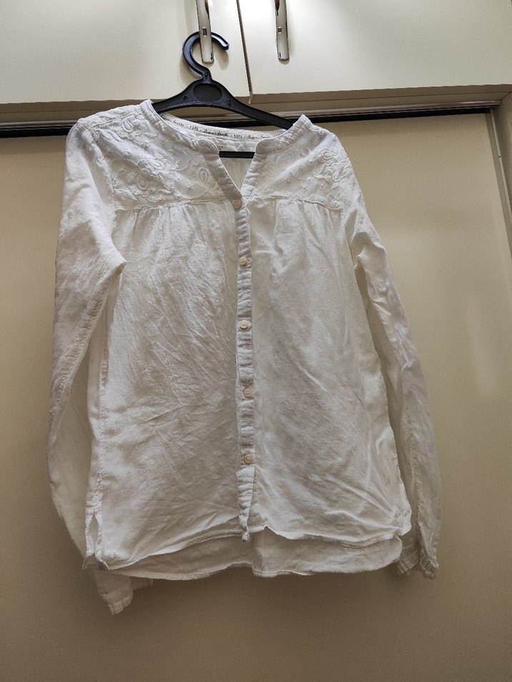 Beyaz keten gömlek, uzun kollu ve düğmeli, yakalı ve bol kesim. 13/14 Yaş. 24 saatte kargoya verilir ürün zarar görmeyecek şekilde paketlenir