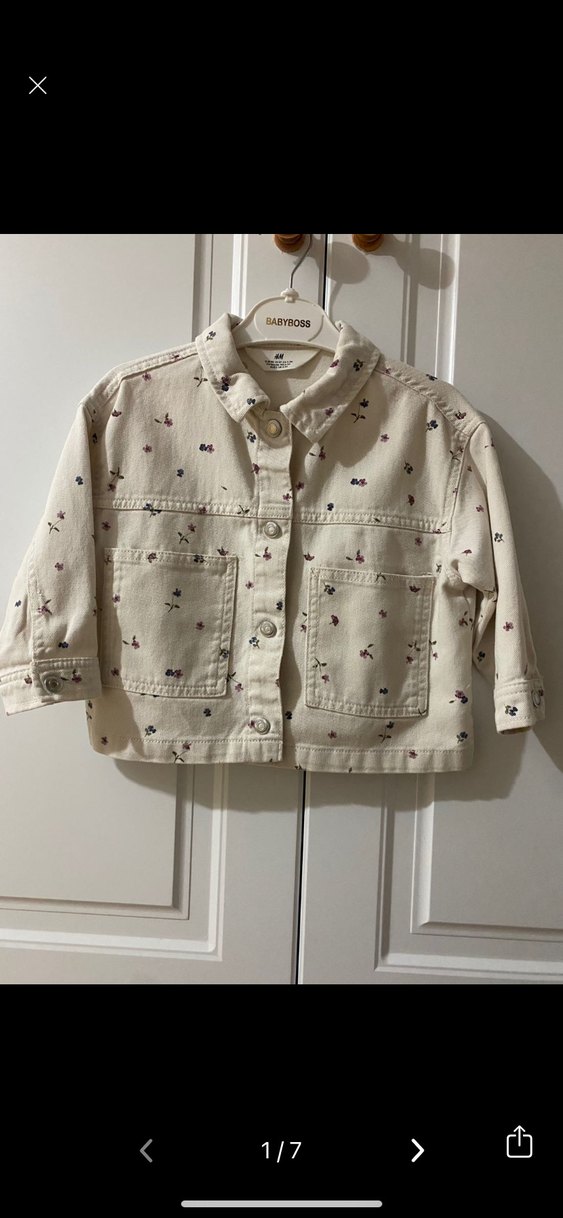 Yumuşak pamuktan yapılmış, düğmeli ve notlu yaka detaylı, nakışlı desenli bol kesim kız çocuk ceketi.