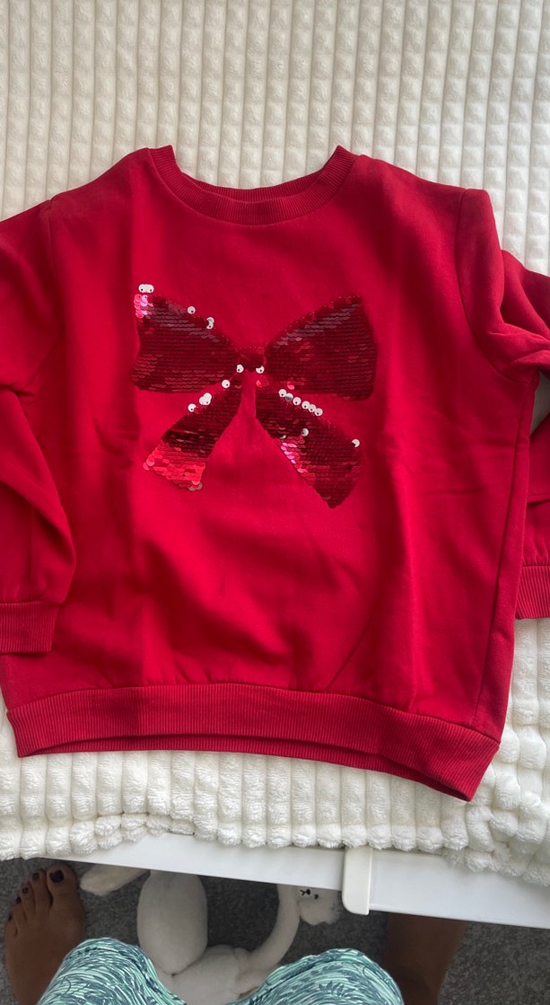 Çok az giyildi yeni gibi Kırmızı renkli, önünde parlak payetli fiyonk detaylı sweatshirt. Uzun kollu, yuvarlak yaka, bol kesim ve normal boyda, sentetik kumaştan rahat bir model.