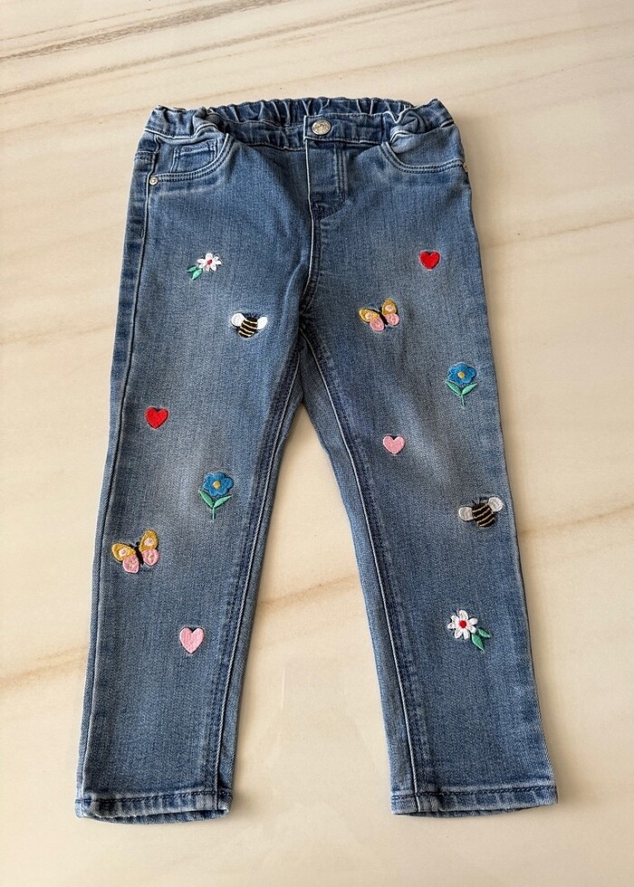 H&M kız çocuk kot pantolonu. Ön ve arka cepleri var. Ön tarafı dikiş nakiş motif detaylı. 2-3 yaş için uygun.