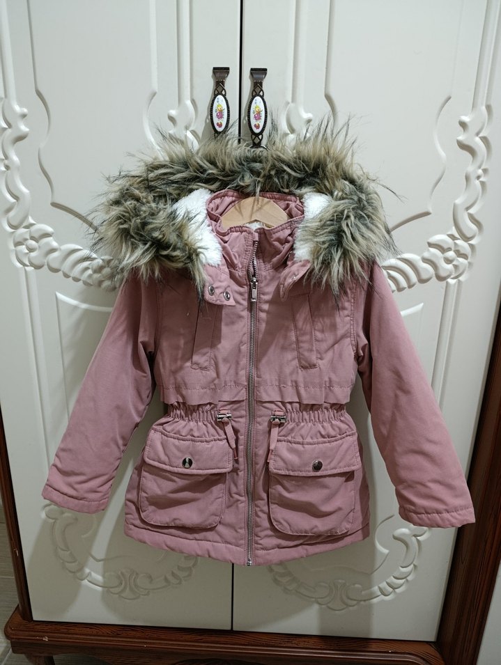 Pembe renkli, kürklü detaylı kapüşonlu, fitted kesim ceket. Yumuşak fleece kumaş ve cepli, desen içermeyen şık bir street wear modeli. sayılı giyildi hiçbir kusuru yoktur 4-5 yaş