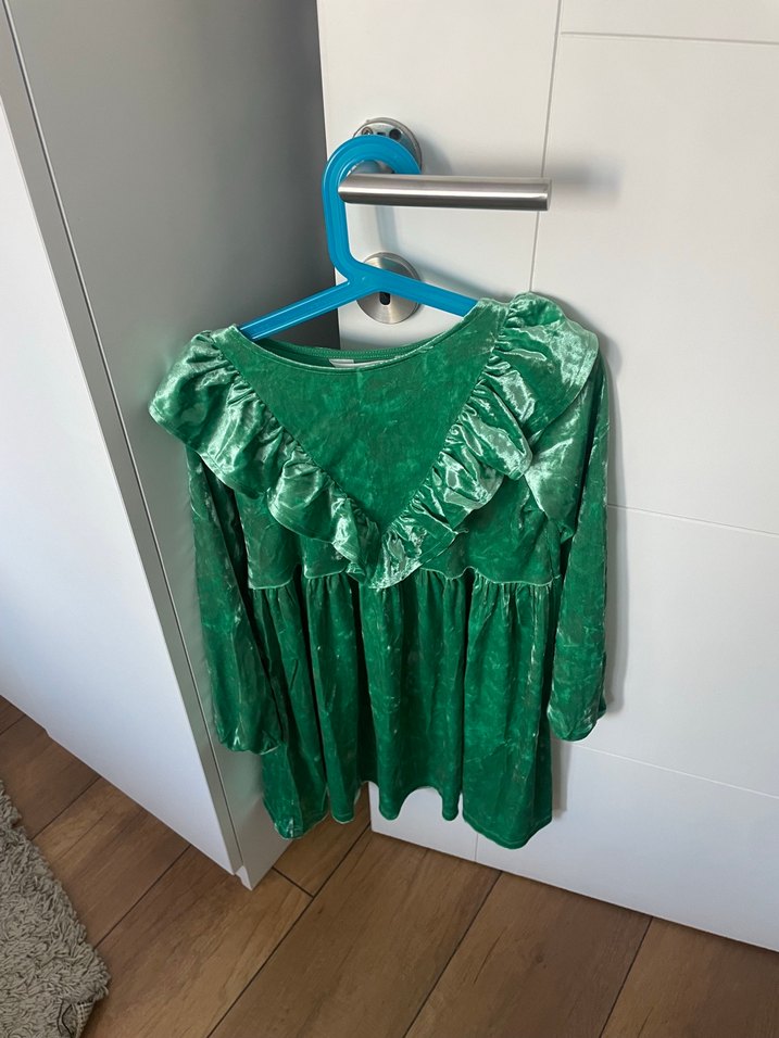 Parlak yeşil keten kumaştan, uzun kollu, yuvarlak yakalı, fırfırlı ve bol kesim kız çocuk elbisesi. Bohem tarzda batik desenlidir.