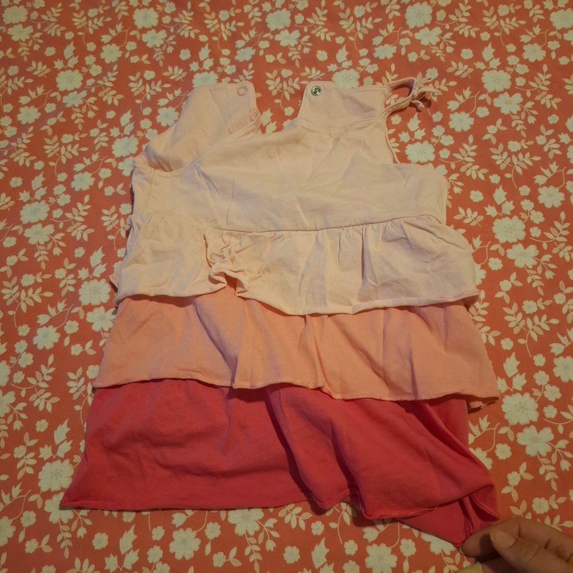Kolsuz, fırfırlı ve bol kesimli pembe elbise, yumuşak tekstil kumaştan yapılmıştır ve straplez yakaya sahiptir.