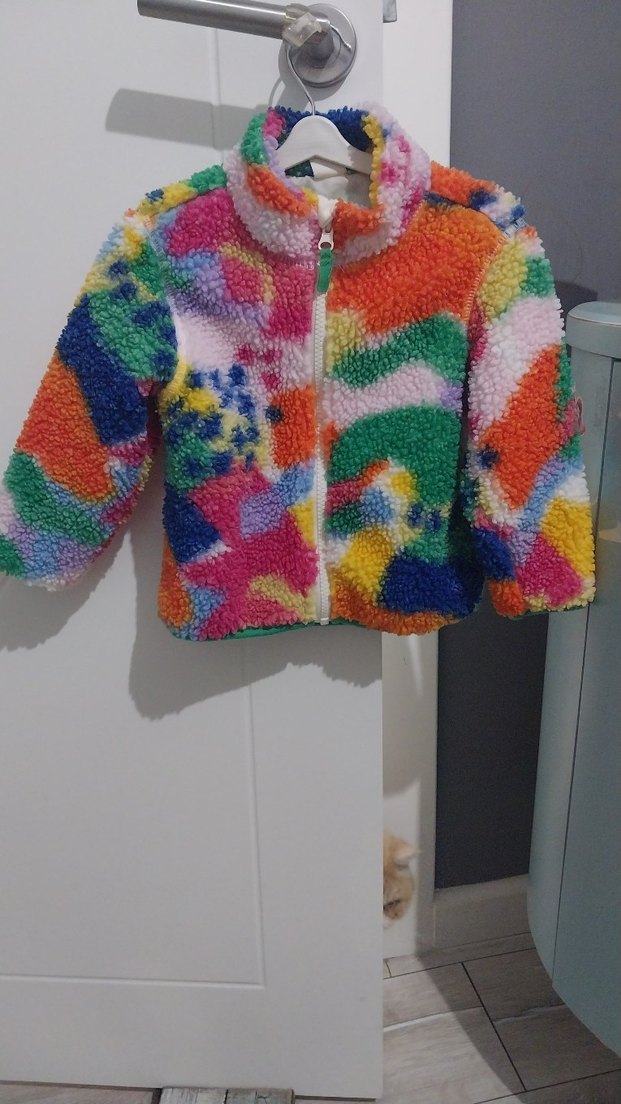 Renkli batik desenli, fitted kesim kız çocuk montu. Yumuşak ve sıcak kumaştan, bohem ve retro tarzda. kullanima bagli fermuarda ufak sökük var baska sorunu yok.