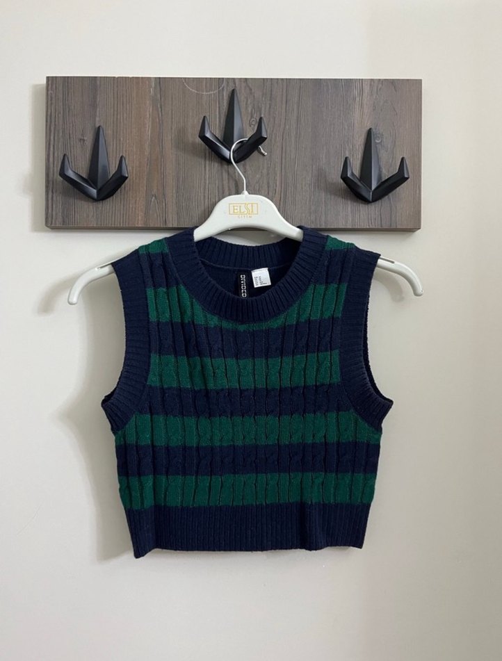 Koyu yeşil çizgili kısa kesim, kolsuz ve boğazlı triko süveter. Örgü kumaştan, rahat ve günlük kullanıma uygun.