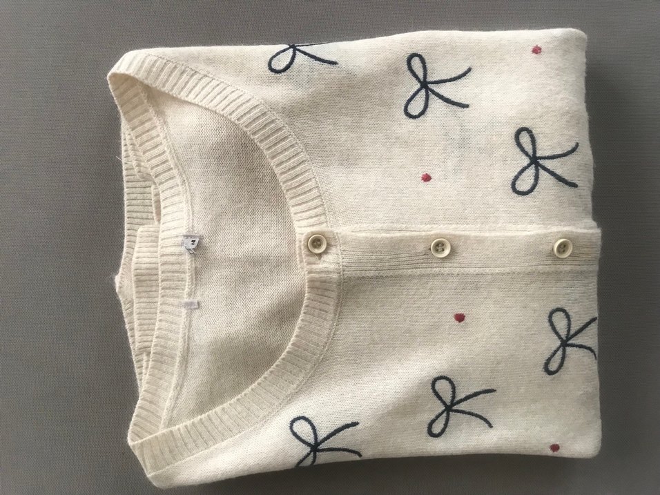 Nakışlı detaylara ve düğmelere sahip beyaz örme hırka, yuvarlak yaka ve uzun kolludur. Bol kesim ve midi boyda, gündelik şıklık için idealdir. Marka temsilidir