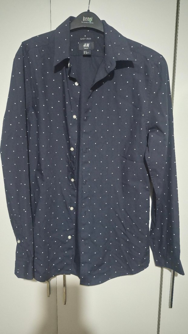 H&M marka, lacivert renkli, puantiyeli, pamuklu uzun kollu erkek gömleği. hiç giyilmedi.