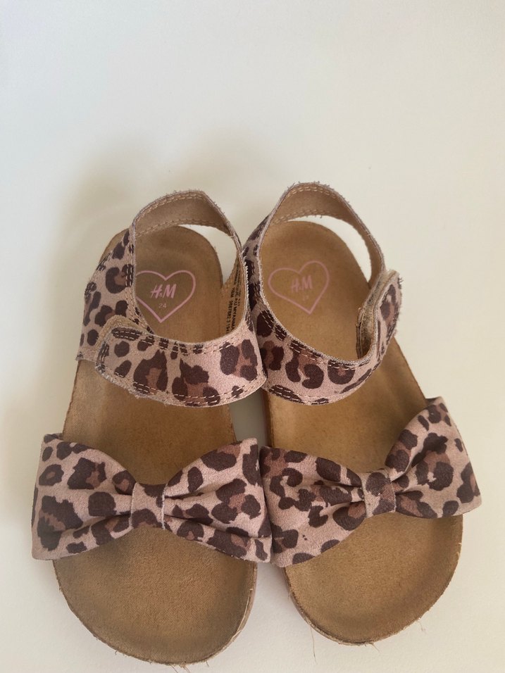 H&M kız sandaletleri, pastel kahverengi leopar deseni ve fiyonk detayları ile rahat kauçuk tabana sahiptir.