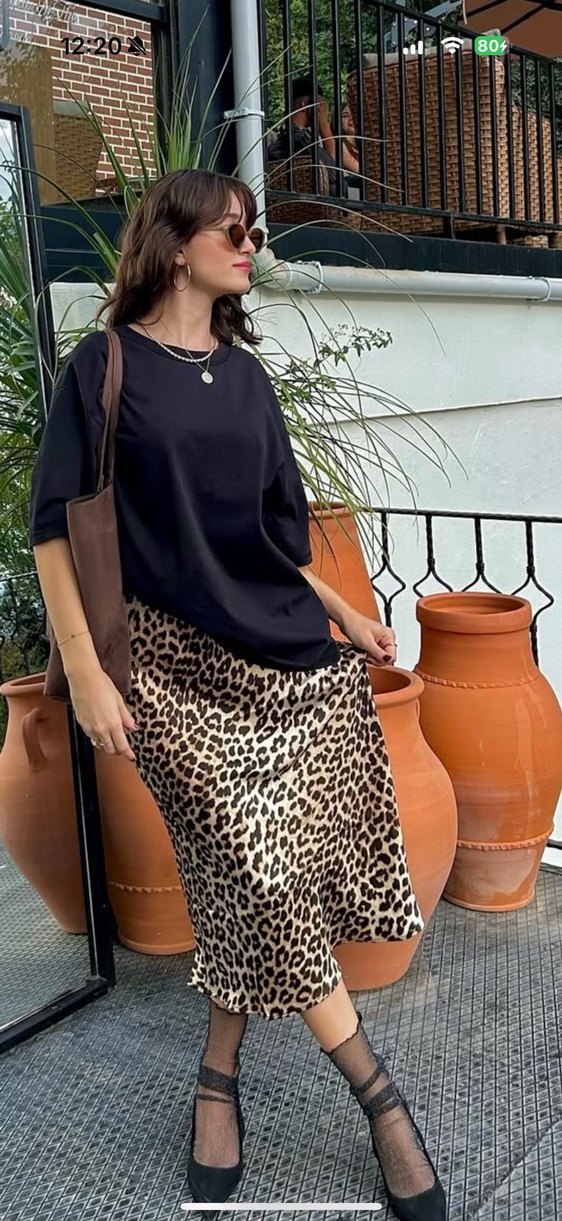 Kahverengi, leopar desenli, bol kesim midi etek, yumuşak sentetik kumaştan bir kez giyildi