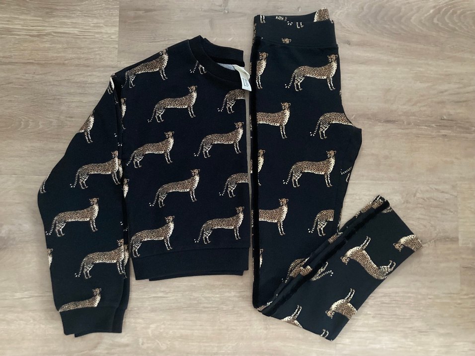 Kürk detaylı, leopar desenli siyah, streetwear tarzında tasarlanmıştır. 8/10 yaş 134/140 cm