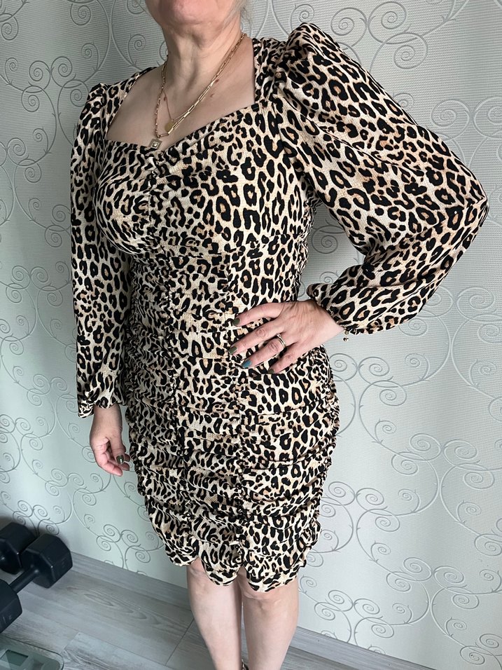 Leopar desenli, öpücük yakalı ve uzun kollu, vücuda oturan midi elbise, iddialı bir tarz sunar.