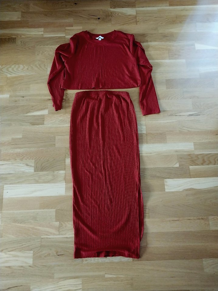 yeniden farksız.Bordo renkte, uzun kollu, bisiklet yaka üst ve uzun etekten oluşan, minimal ve şık görünümlü.