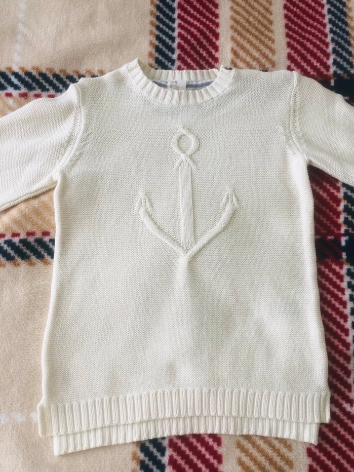 Beyaz renkli, triko örgüden üretilmiş, yuvarlak yakalı ve uzun kollu erkek çocuk kazak. Önünde ince bir çapa deseni bulunur. Rahat kesimdir. ⚓