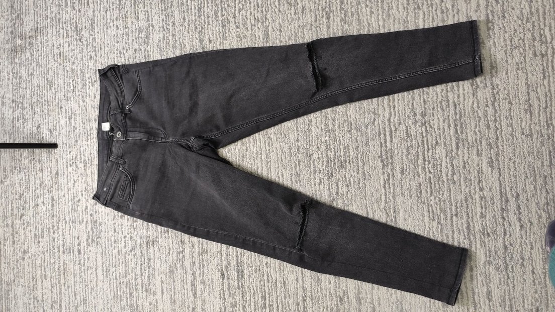 H&M marka Dizlerde yırtık detaylı, fitted kesim gri denim pantolon. Midi boy ve desensiz, günlük sokak stili için uygun.