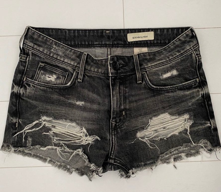 H&M marka gri renkli ve yırtık detaylı, mini kadın denim şort. Grunge punk tarzına uygun.