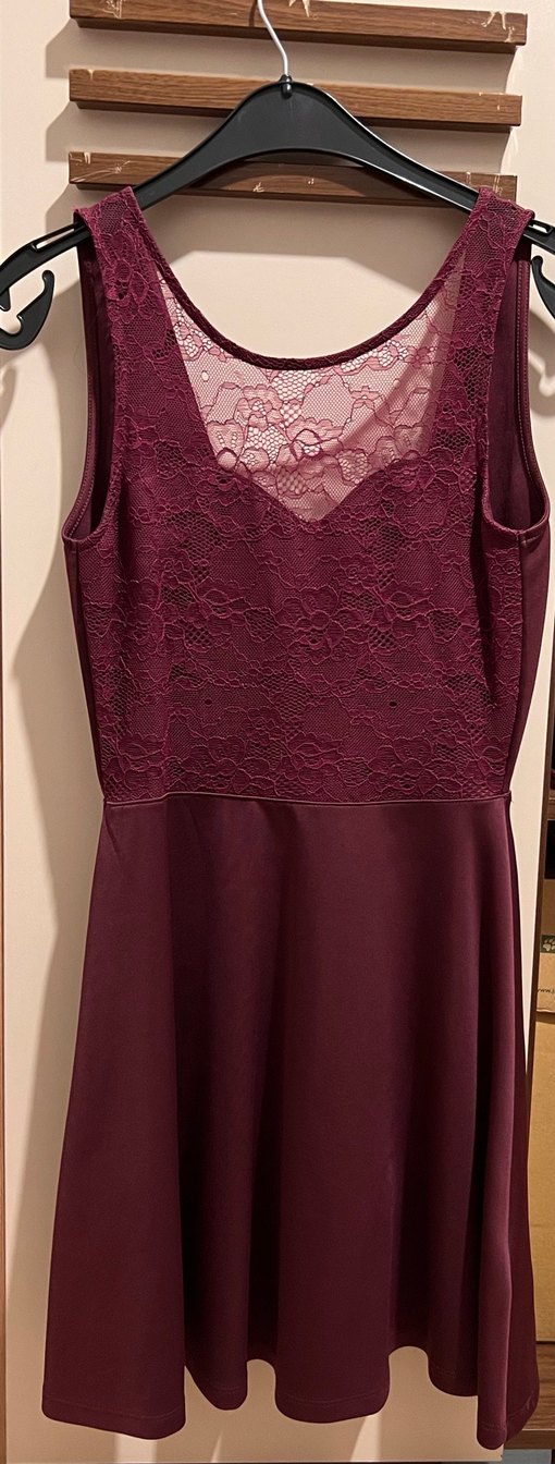H&M marka ,Mor renkte, dantelli üst kısmı ve V yaka detaylı, kolsuz ve mini boyda , üstü oturan, etek kısmı geniş kesim gece elbisesi. Romantik akşamlar için uygundur.