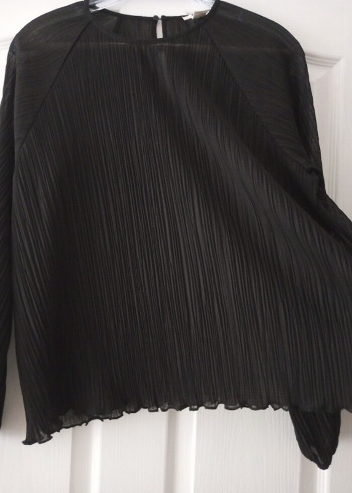 Bürümcük siyah şifon ince kumaş bisiklet yaka ense kısmı düğmeli uzun lastikli bol kol sade şık bluz etek pantolon kombin olur