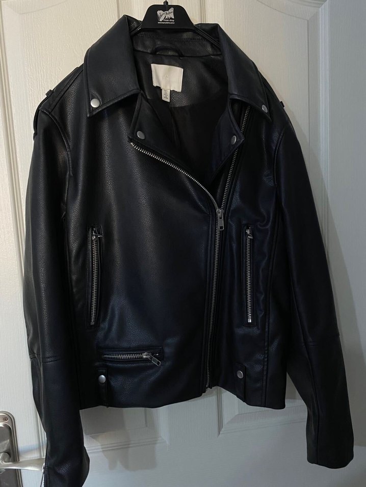 Siyah deri biker ceket, fitted kesim, çıtçıtlı yakalı ve fermuarlı detaylara sahip, şık ve günlük kullanıma uygun.