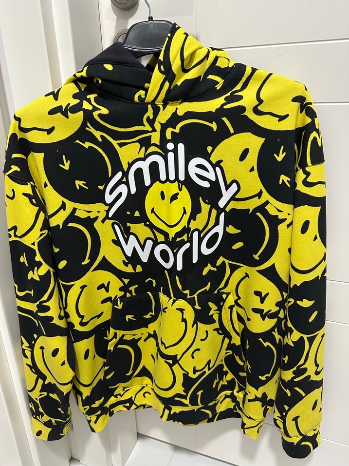 Smiley Sarı kapüşonlu sweatshirt, renkli baskılı desenlidir. 2-3 kere giyilmiştir.