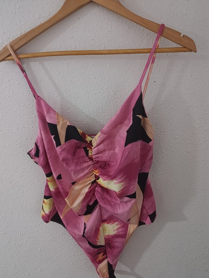 V yaka ve ince askılı, pembe bağlama desenli, drapeli, kısa kesim, bohem stilinde oturan bir büstiyer.
