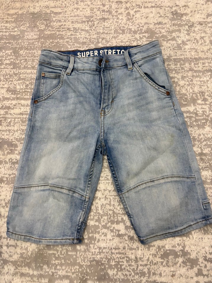 Bol kesim, fermuarlı erkek denim şort, SUPERSTRET etiketli yumuşak ve esnek kumaştan, gri mavi renkte sade tasarım.tertemiz h&m