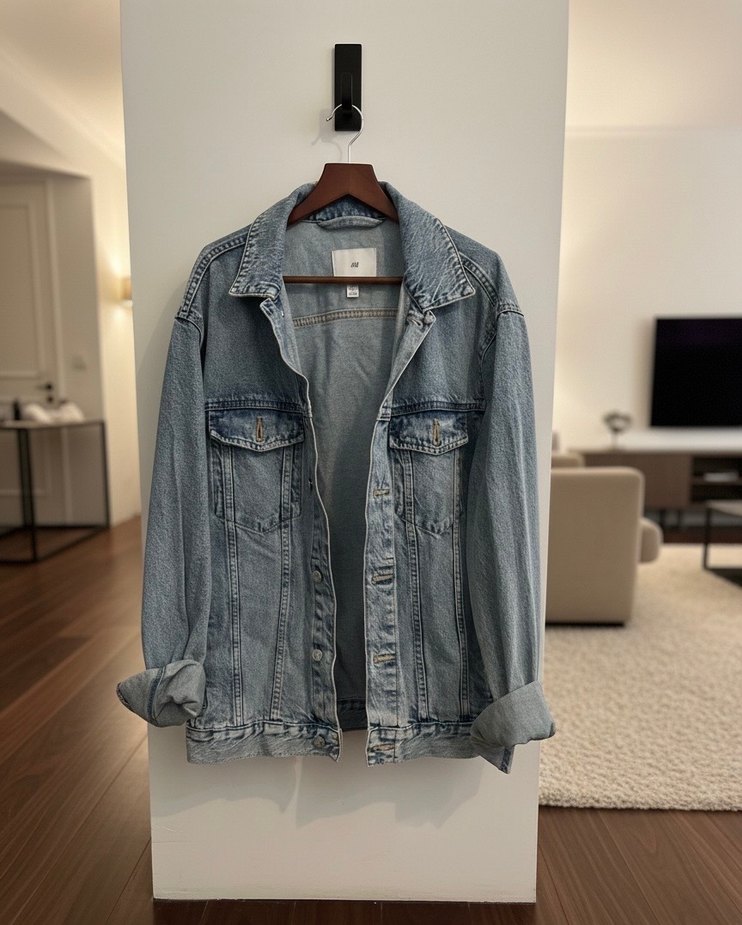 Mavi renk , düğmeli, cepli ve notched yakalı uzun kollu kadın denim ceket. Rahat kesimi ve midi boyuyla günlük sokak stili için uygundur.