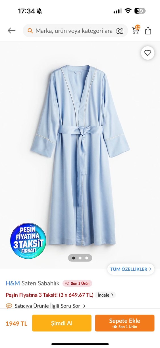 H&M markalı, pastel mavi renkli, uzun kollu ve bol kesim saten sabahlık. Belden bağlamalı, minimal ve çağdaş tasarıma sahip.