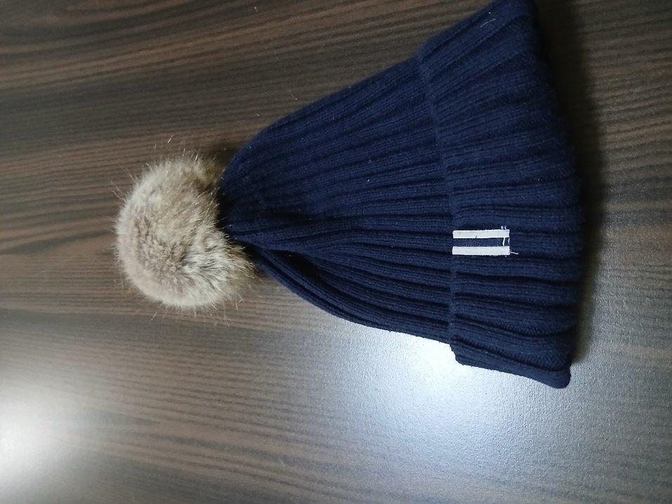 Erkek çocuk için yün malzemeden yapılmış, kürk ponpon detaylı mavi bere. Sokak stili ve rahat kullanıma uygun, gri küçük detaylar içerir.