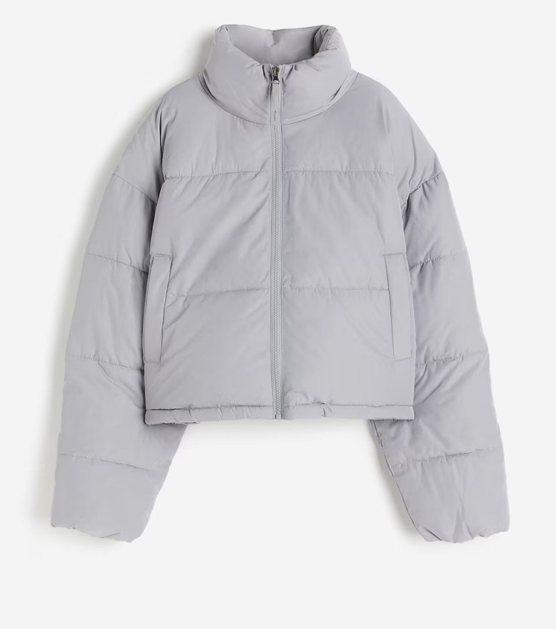 Yüksek yakalı, uzun kollu ve fermuarlı gri kadın kışlık mont. Yumuşak, sıcak kumaştan, rahat ve şık bir sokak stili için uygun.
