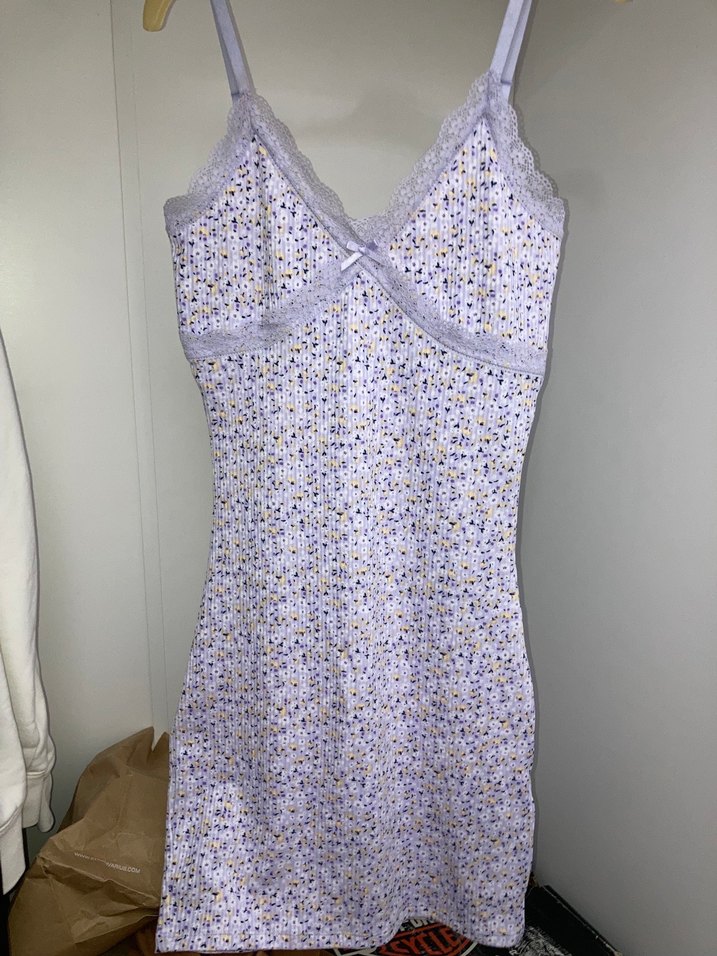 Kolsuz, V yaka ve midi boyda, pastel mor çiçek desenli, dantel detaylı fitilli h&m elbise üzerinize oturuyor tertemiz.